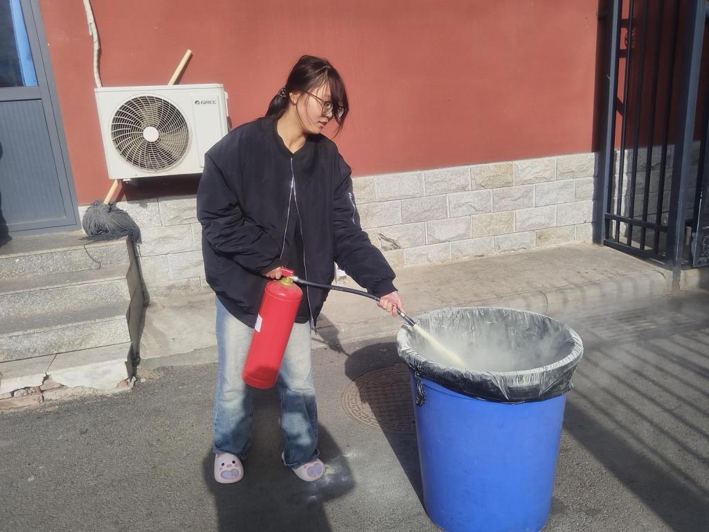 集合后,宿管员清点人数并逐级上报,确认全员安全撤离。保卫部工作人员现场点评演练细节,指出“女生要注意长头发盘起来”等问题。随后马老师演示灭火器操作方法,组织学生实操演练,强化初期火灾扑救能力。